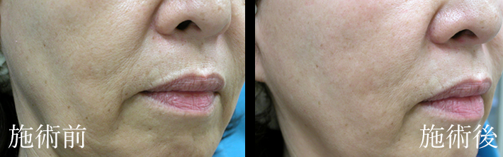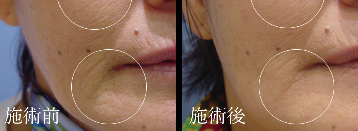 └ 加齢による口元のシワ。集中して線維芽細胞培養注入したことで、口元のシワが軽減され深いシワも浅くなり、 肌のハリや艶など肌若返りが見られました。